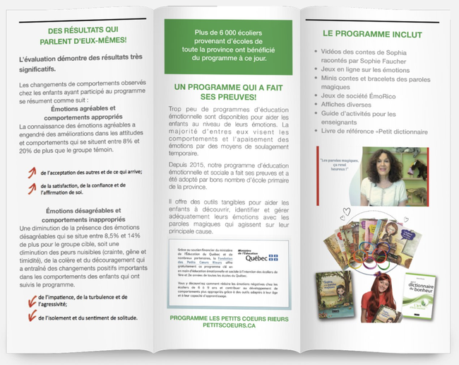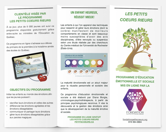 La FONDATION DES PETITS CŒURS RIEURS est un organisme de charité qui œuvre pour le développement de la santé émotionnelle, psychologique et sociale des enfants et des jeunes de moins de 18 ans. C’est principalement en offrant des activités du programme d’éducation émotionnelle Les Petits Cœurs Rieurs réalisées en classe auprès des écoliers d’écoles primaires que nous offrons des outils de découverte et d’apprentissage d’une saine gestion des émotions. Ceux-ci aideront les enfants à être plus autonomes et heureux. Nous escomptons que ce programme favorise la diminution de l’agressivité et de la violence et contribuera à réduire l’intimidation à l’école et le décrochage scolaire.