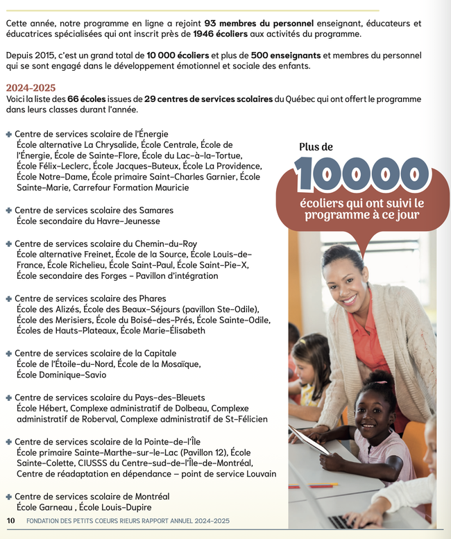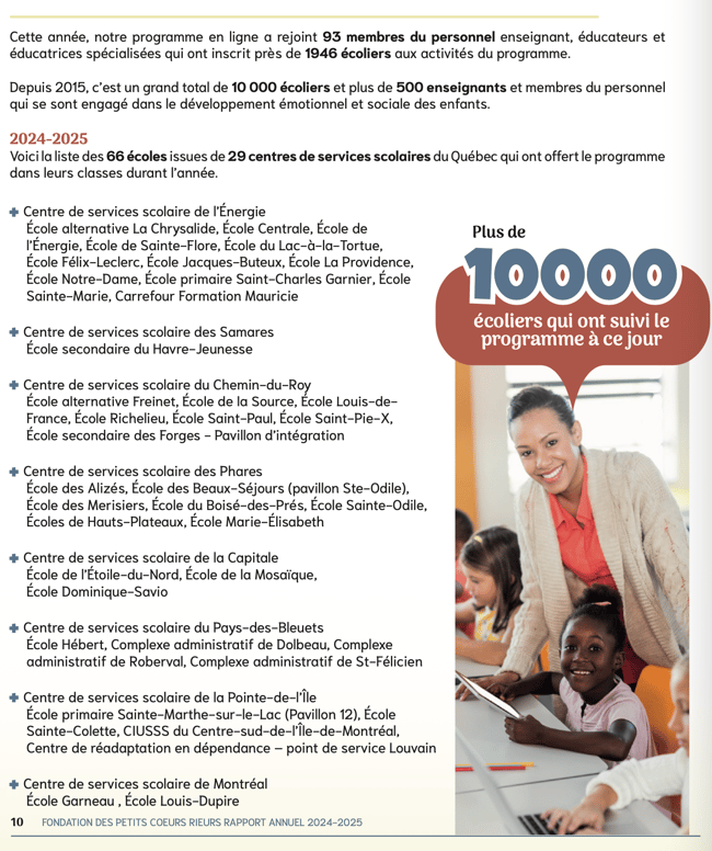 Ce programme encourage le développement émotionnel et affectif des enfants, des éléments essentiels à leur réussite scolaire. De plus, il favorise l'adoption de comportements sains, réduit les cas de violence et d'intimidation à l'école, tout en renforçant le potentiel de persévérance scolaire.